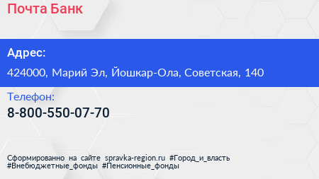 Почта Банк по адресу 424000, Марий Эл, Йошкар-Ола, Советская, 140 в дальнейшем Организация, размещена в следующих категориях: