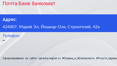 Почта Банк, банкомат по адресу 424007, Марий Эл, Йошкар-Ола, Строителей, 42а в дальнейшем Организация, размещена в следующих категориях:
