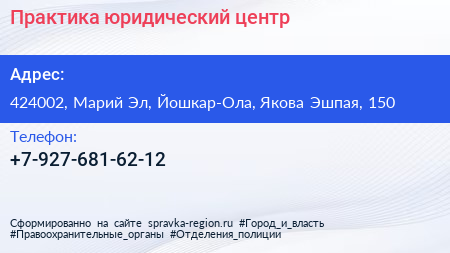 Практика, юридический центр по адресу 424002, Марий Эл, Йошкар-Ола, Якова Эшпая, 150 в дальнейшем Организация, размещена в следующих категориях: