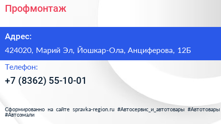 Профмонтаж по адресу 424020, Марий Эл, Йошкар-Ола, Анциферова, 12Б в дальнейшем Организация, размещена в следующих категориях: