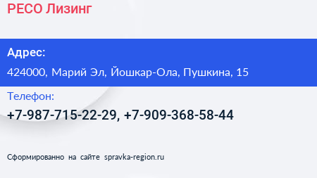 РЕСО-Лизинг по адресу 424000, Марий Эл, Йошкар-Ола, Пушкина, 15 в дальнейшем Организация, размещена в следующих категориях: