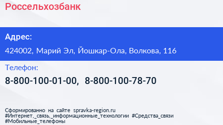 Россельхозбанк по адресу 424002, Марий Эл, Йошкар-Ола, Волкова, 116 в дальнейшем Организация, размещена в следующих категориях: