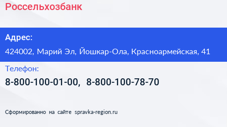 Россельхозбанк по адресу 424002, Марий Эл, Йошкар-Ола, Красноармейская, 41 в дальнейшем Организация, размещена в следующих категориях: