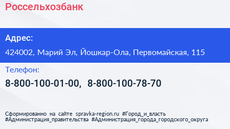 Россельхозбанк по адресу 424002, Марий Эл, Йошкар-Ола, Первомайская, 115 в дальнейшем Организация, размещена в следующих категориях: