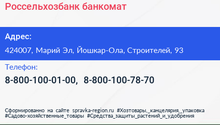 Россельхозбанк, банкомат по адресу 424007, Марий Эл, Йошкар-Ола, Строителей, 93 в дальнейшем Организация, размещена в следующих категориях: