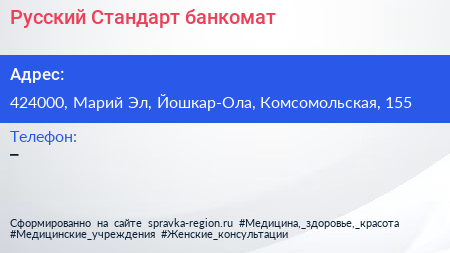 Русский Стандарт, банкомат по адресу 424000, Марий Эл, Йошкар-Ола, Комсомольская, 155 в дальнейшем Организация, размещена в следующих категориях: