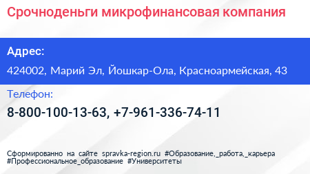 Срочноденьги, микрофинансовая компания по адресу 424002, Марий Эл, Йошкар-Ола, Красноармейская, 43 в дальнейшем Организация, размещена в следующих категориях:
