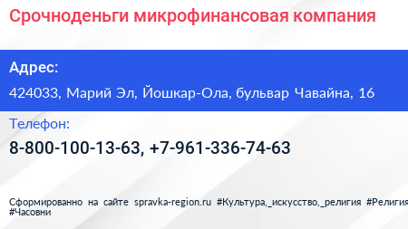 Срочноденьги, микрофинансовая компания по адресу 424033, Марий Эл, Йошкар-Ола, бульвар Чавайна, 16 в дальнейшем Организация, размещена в следующих категориях: