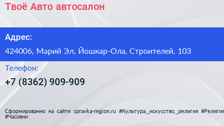 Твоё Авто, автосалон по адресу 424006, Марий Эл, Йошкар-Ола, Строителей, 103 в дальнейшем Организация, размещена в следующих категориях: