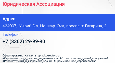 Юридическая Ассоциация по адресу 424007, Марий Эл, Йошкар-Ола, проспект Гагарина, 2 в дальнейшем Организация, размещена в следующих категориях: