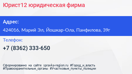 Юрист12, юридическая фирма по адресу 424016, Марий Эл, Йошкар-Ола, Панфилова, 39г в дальнейшем Организация, размещена в следующих категориях: