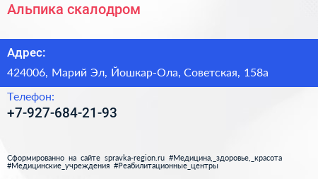 Альпика, скалодром по адресу 424006, Марий Эл, Йошкар-Ола, Советская, 158а в дальнейшем Организация, размещена в следующих категориях: