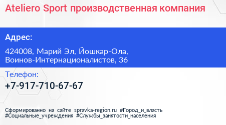 Ateliero Sport, производственная компания по адресу 424008, Марий Эл, Йошкар-Ола, Воинов-Интернационалистов, 36 в дальнейшем Организация, размещена в следующих категориях: