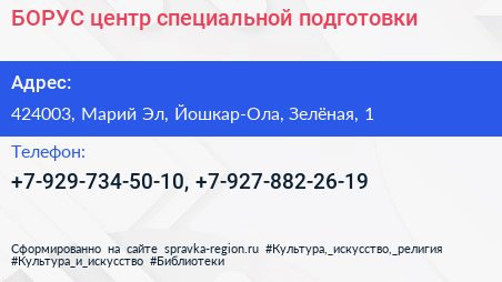 БОРУС, центр специальной подготовки по адресу 424003, Марий Эл, Йошкар-Ола, Зелёная, 1 в дальнейшем Организация, размещена в следующих категориях:
