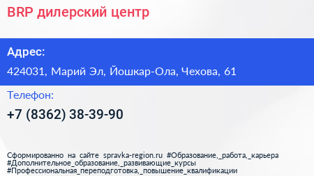 BRP, дилерский центр по адресу 424031, Марий Эл, Йошкар-Ола, Чехова, 61 в дальнейшем Организация, размещена в следующих категориях: