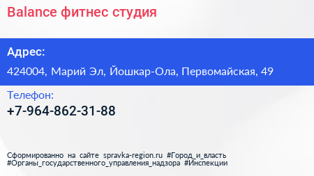 Balance, фитнес-студия по адресу 424004, Марий Эл, Йошкар-Ола, Первомайская, 49 в дальнейшем Организация, размещена в следующих категориях: