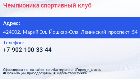 Чемпионика, спортивный клуб по адресу 424002, Марий Эл, Йошкар-Ола, Ленинский проспект, 54 в дальнейшем Организация, размещена в следующих категориях: