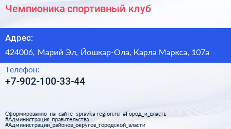 Чемпионика, спортивный клуб по адресу 424006, Марий Эл, Йошкар-Ола, Карла Маркса, 107а в дальнейшем Организация, размещена в следующих категориях:
