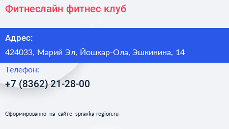 Фитнеслайн, фитнес-клуб по адресу 424033, Марий Эл, Йошкар-Ола, Эшкинина, 14 в дальнейшем Организация, размещена в следующих категориях: