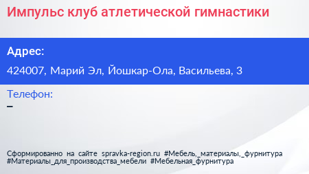 Импульс, клуб атлетической гимнастики по адресу 424007, Марий Эл, Йошкар-Ола, Васильева, 3 в дальнейшем Организация, размещена в следующих категориях: