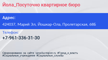 Йола_Посуточно, квартирное бюро по адресу 424037, Марий Эл, Йошкар-Ола, Пролетарская, 68Б в дальнейшем Организация, размещена в следующих категориях: