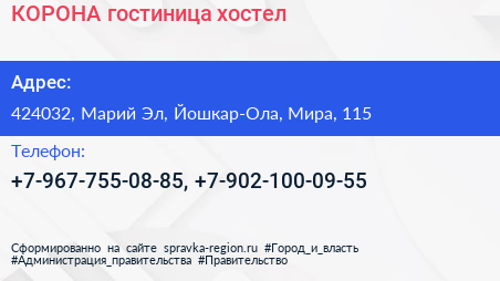 КОРОНА, гостиница-хостел по адресу 424032, Марий Эл, Йошкар-Ола, Мира, 115 в дальнейшем Организация, размещена в следующих категориях: