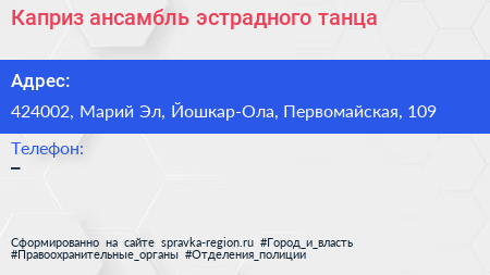 Каприз, ансамбль эстрадного танца по адресу 424002, Марий Эл, Йошкар-Ола, Первомайская, 109 в дальнейшем Организация, размещена в следующих категориях: