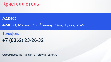 Кристалл, отель по адресу 424030, Марий Эл, Йошкар-Ола, Тукая, 2 к2 в дальнейшем Организация, размещена в следующих категориях:
