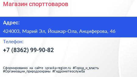Магазин спорттоваров по адресу 424003, Марий Эл, Йошкар-Ола, Анциферова, 46 в дальнейшем Организация, размещена в следующих категориях:
