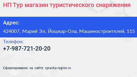 НП-Тур, магазин туристического снаряжения по адресу 424007, Марий Эл, Йошкар-Ола, Машиностроителей, 115 в дальнейшем Организация, размещена в следующих категориях: