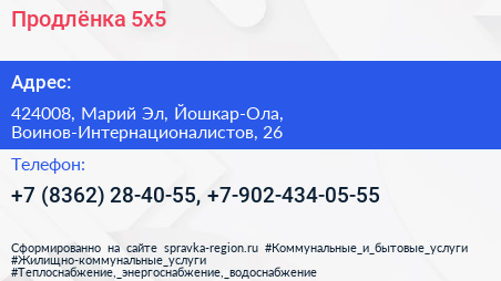 Продлёнка 5х5 по адресу 424008, Марий Эл, Йошкар-Ола, Воинов-Интернационалистов, 26 в дальнейшем Организация, размещена в следующих категориях: