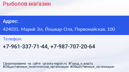Рыболов, магазин по адресу 424031, Марий Эл, Йошкар-Ола, Первомайская, 100 в дальнейшем Организация, размещена в следующих категориях: