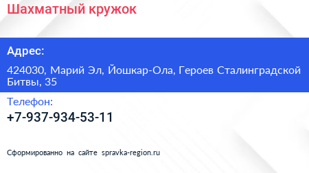 Шахматный кружок по адресу 424030, Марий Эл, Йошкар-Ола, Героев Сталинградской Битвы, 35 в дальнейшем Организация, размещена в следующих категориях: