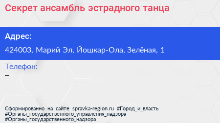 Секрет, ансамбль эстрадного танца по адресу 424003, Марий Эл, Йошкар-Ола, Зелёная, 1 в дальнейшем Организация, размещена в следующих категориях: