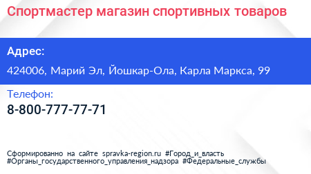 Спортмастер, магазин спортивных товаров по адресу 424006, Марий Эл, Йошкар-Ола, Карла Маркса, 99 в дальнейшем Организация, размещена в следующих категориях: