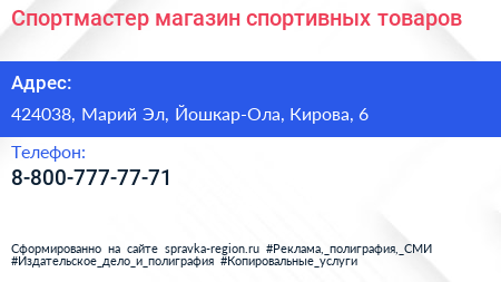 Спортмастер, магазин спортивных товаров по адресу 424038, Марий Эл, Йошкар-Ола, Кирова, 6 в дальнейшем Организация, размещена в следующих категориях:
