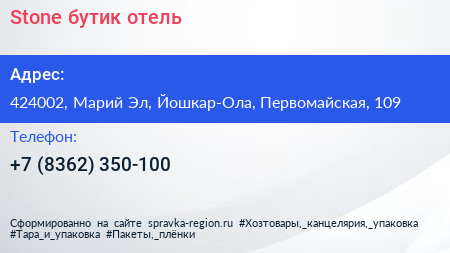 Stone, бутик-отель по адресу 424002, Марий Эл, Йошкар-Ола, Первомайская, 109 в дальнейшем Организация, размещена в следующих категориях: