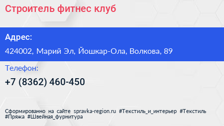 Строитель, фитнес-клуб по адресу 424002, Марий Эл, Йошкар-Ола, Волкова, 89 в дальнейшем Организация, размещена в следующих категориях: