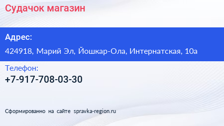 Судачок, магазин по адресу 424918, Марий Эл, Йошкар-Ола, Интернатская, 10а в дальнейшем Организация, размещена в следующих категориях: