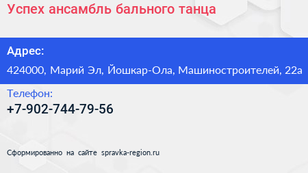 Успех, ансамбль бального танца по адресу 424000, Марий Эл, Йошкар-Ола, Машиностроителей, 22а в дальнейшем Организация, размещена в следующих категориях: