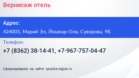 Вернисаж, отель по адресу 424003, Марий Эл, Йошкар-Ола, Суворова, 9Б в дальнейшем Организация, размещена в следующих категориях: