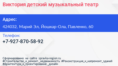 Виктория, детский музыкальный театр по адресу 424032, Марий Эл, Йошкар-Ола, Павленко, 60 в дальнейшем Организация, размещена в следующих категориях: