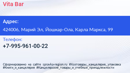 Vita-Bar по адресу 424006, Марий Эл, Йошкар-Ола, Карла Маркса, 99 в дальнейшем Организация, размещена в следующих категориях: