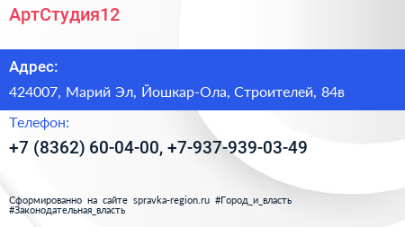 АртСтудия12 по адресу 424007, Марий Эл, Йошкар-Ола, Строителей, 84в в дальнейшем Организация, размещена в следующих категориях: