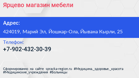 Ярцево, магазин мебели по адресу 424019, Марий Эл, Йошкар-Ола, Йывана Кырли, 25 в дальнейшем Организация, размещена в следующих категориях: