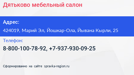 Дятьково, мебельный салон по адресу 424019, Марий Эл, Йошкар-Ола, Йывана Кырли, 25 в дальнейшем Организация, размещена в следующих категориях:
