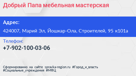 Добрый Папа, мебельная мастерская по адресу 424007, Марий Эл, Йошкар-Ола, Строителей, 95 к101а в дальнейшем Организация, размещена в следующих категориях: