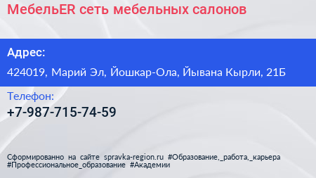 МебельER, сеть мебельных салонов по адресу 424019, Марий Эл, Йошкар-Ола, Йывана Кырли, 21Б в дальнейшем Организация, размещена в следующих категориях: