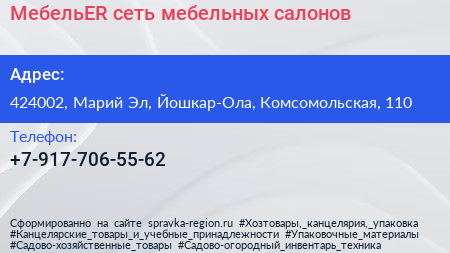 МебельER, сеть мебельных салонов по адресу 424002, Марий Эл, Йошкар-Ола, Комсомольская, 110 в дальнейшем Организация, размещена в следующих категориях: