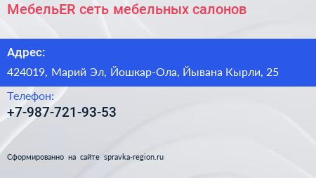 МебельER, сеть мебельных салонов по адресу 424019, Марий Эл, Йошкар-Ола, Йывана Кырли, 25 в дальнейшем Организация, размещена в следующих категориях: